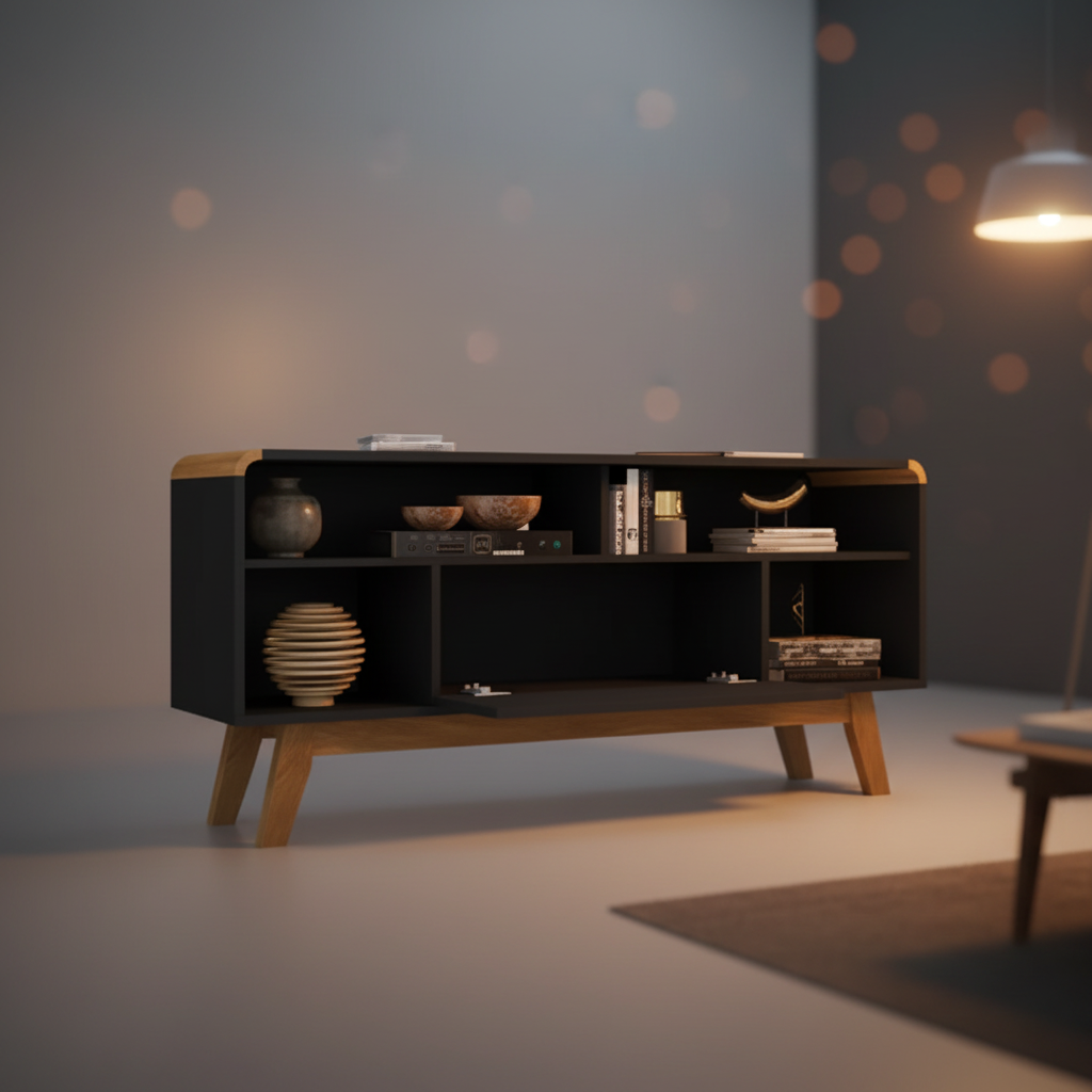 • Smart Storage Solutions – Combines open shelves and closed compartments for organized media gear.